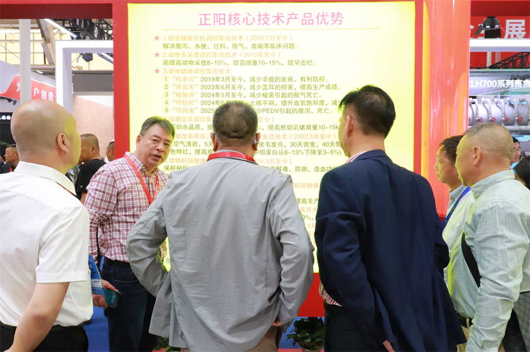 本次展会新正阳公司以海报形式呈现了 “正阳核心技术优势产品”,推荐高效养猪饲喂模式(70日龄猪挑战70斤体重,180日龄猪超150kg体重),以及“杜菲宝”、“度蓝宝”、“梭胀消”、“呼吸保”、“泻保康”等功能型、保健型产品,其中“度蓝宝”是主推产品,可抑制蓝耳病毒复制。